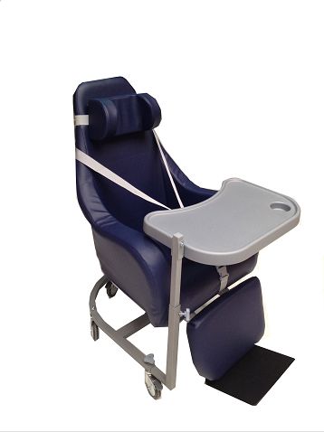 Platine de siège inclinable par vérin, pieds télescopique sur roulettes, repose-pieds avec appui jambes, tablette à rangement vertical. Poids max. utilisateur 120 kg