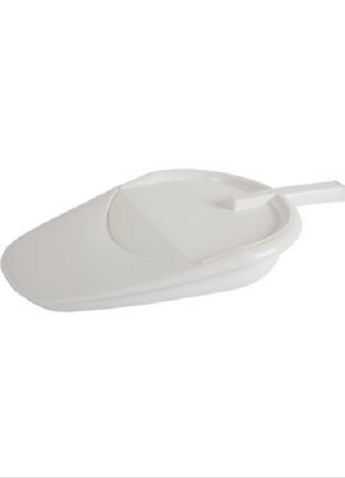 Bassin de lit avec poignée droite. Avec ou sans couvercle. Dimensions : 51 x 28 x 9 cm. En polypropylène blanc, autoclavable. Capacité : 2.000 ml. Supporte un poids de 125 kg.